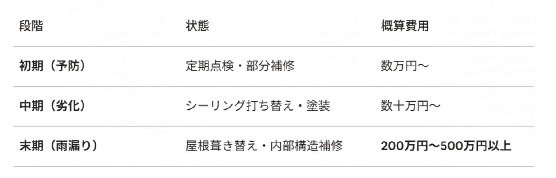 - 雨漏りによる急な出費に怯えないこと